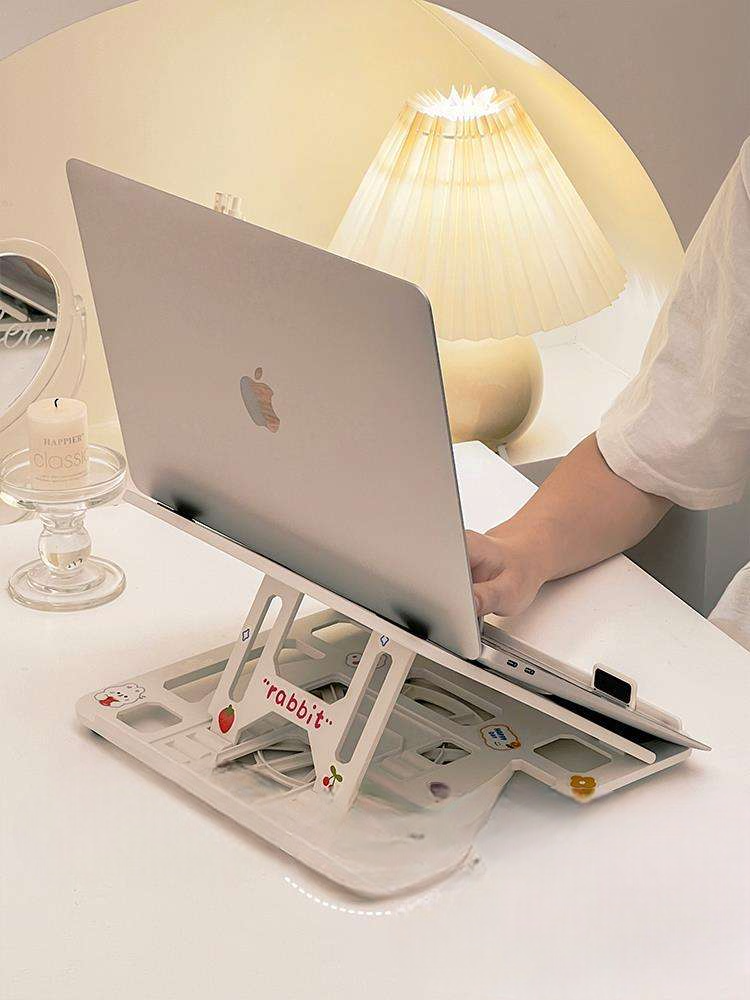 愛らしいうさぎ柄がデザインされた、オシャレで機能的なノートパソコンスタンドです。