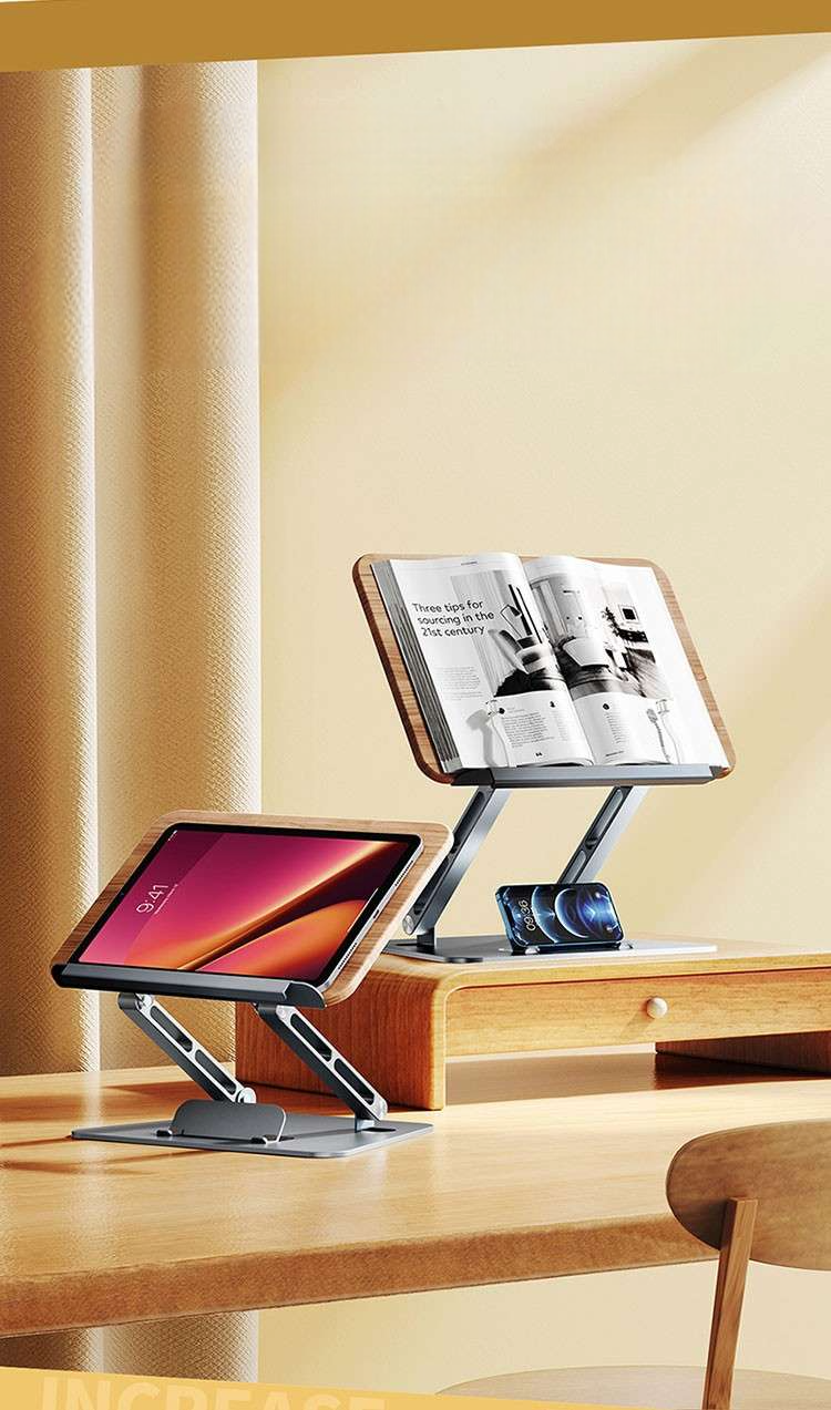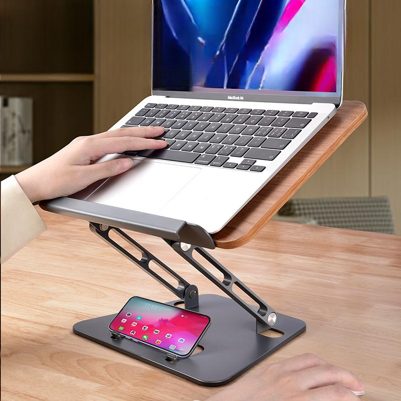 木目調のおしゃれなパソコンスタンド。ノートパソコン用の高さ調節機能付きで、スマートフォンと同時設置も可能。 姿勢改善や作業効率アップを実現し、金属フレームで安定性も確保。 在宅勤務やテレワークに最適な実用的アイテムです。