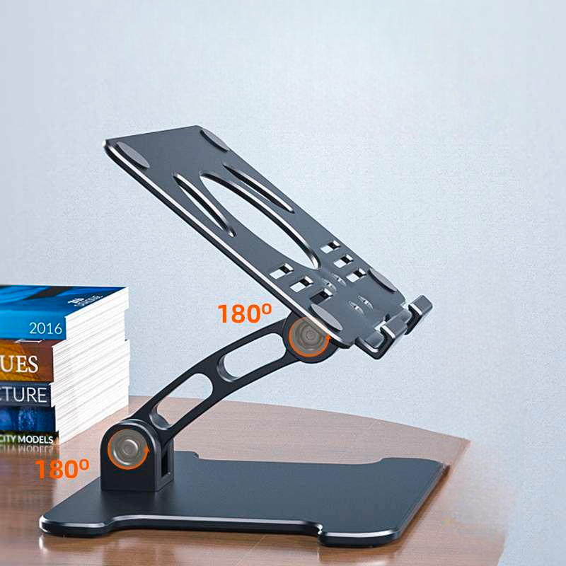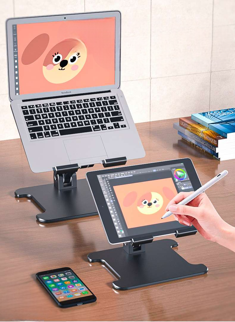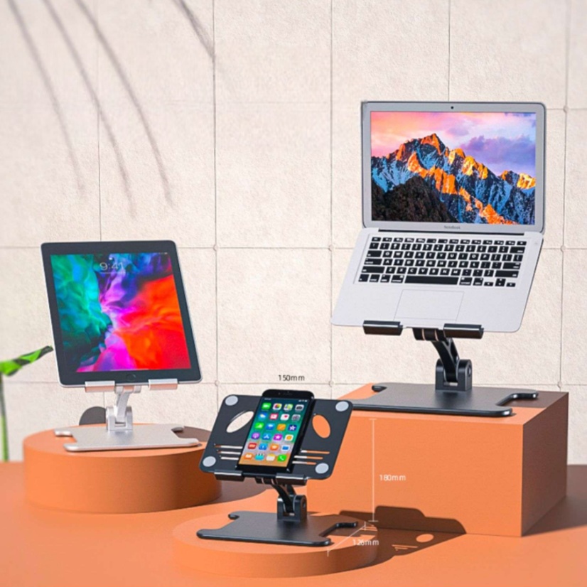ノートパソコン用パソコンスタンド。180度回転可能なアルミ合金製で、高さと角度を自由に調節できます。 熱対策に優れた通気口デザインで、長時間作業も快適。 デスクスペースを効率的に活用でき、人間工学に基づいた設計で姿勢改善にも役立ちます。