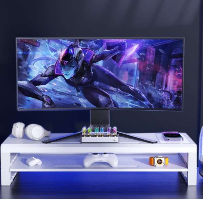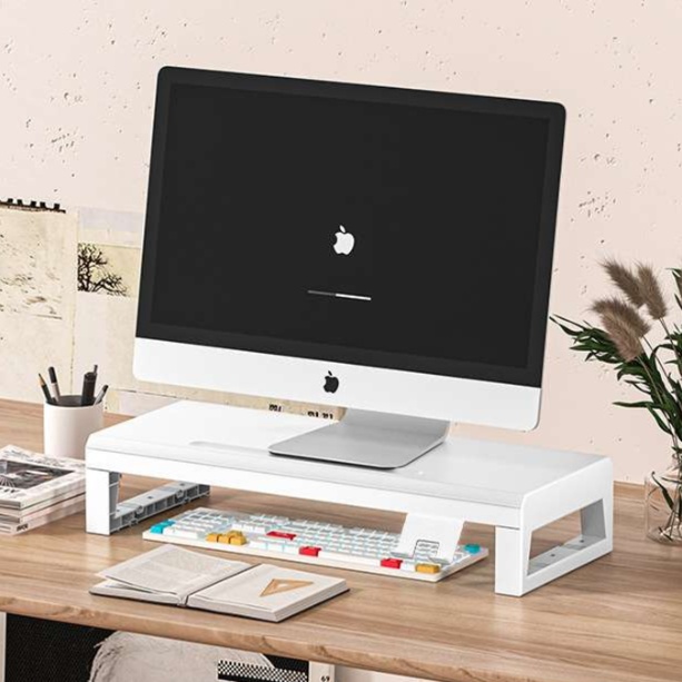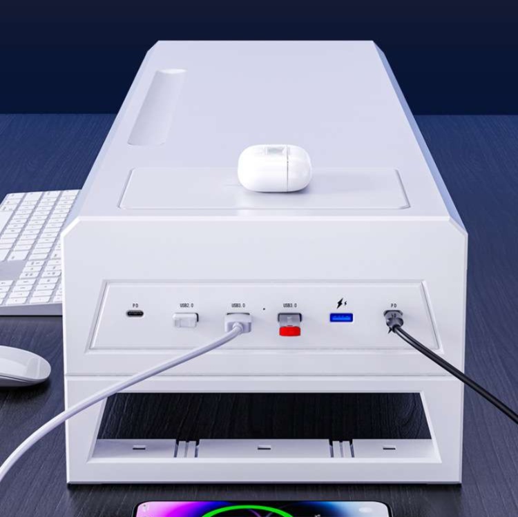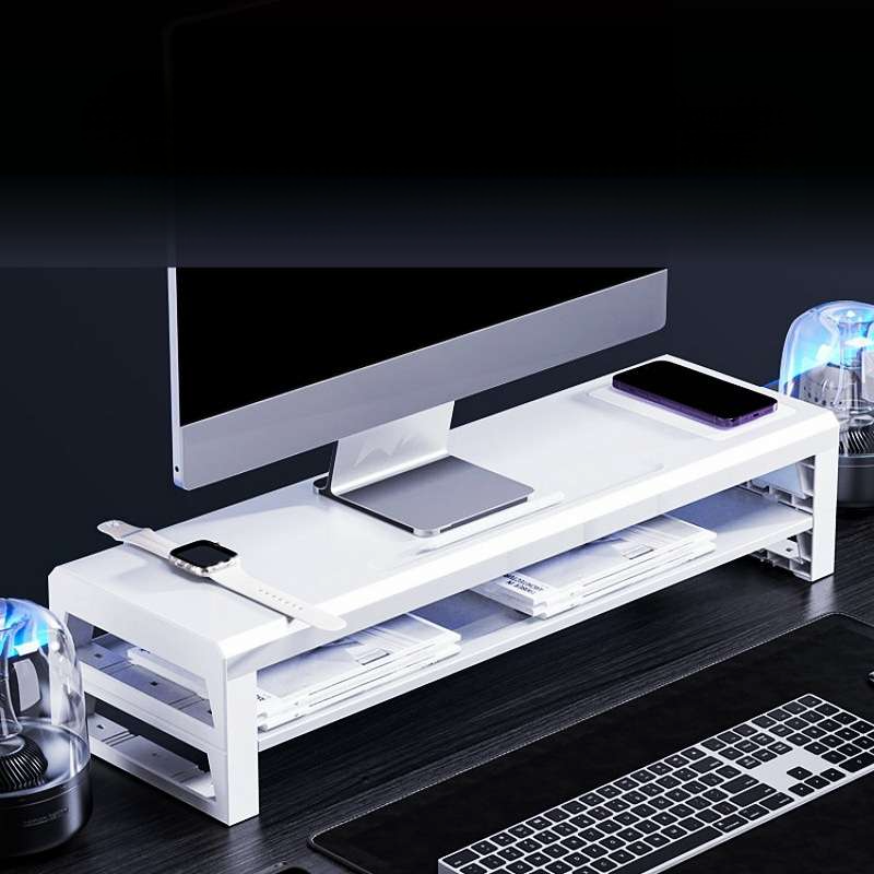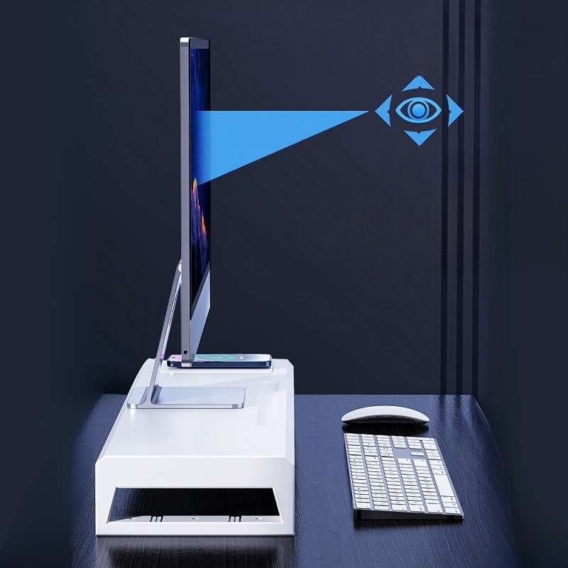多機能パソコンスタンドでモニター下の空間を有効活用。 便利なパソコン台として卓上を整理整頓できる収納スペース付き。 無線充電パッドを搭載し、携帯端末も手軽に充電可能。 高さ調整機能で姿勢改善にも役立つ実用的な設計。