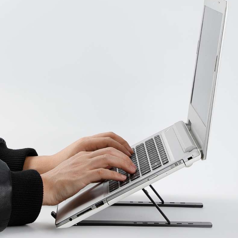 アルミ合金製の軽量パソコンスタンド。ノートパソコン用に設計された高さ調整可能な折りたたみ式で、持ち運びに便利。 滑り止めシリコンパッドがしっかり機器を固定し安定感抜群。 放熱効果も向上するスマートな構造で、作業効率アップに貢献します。