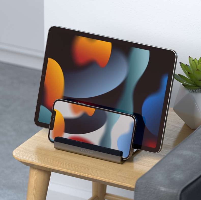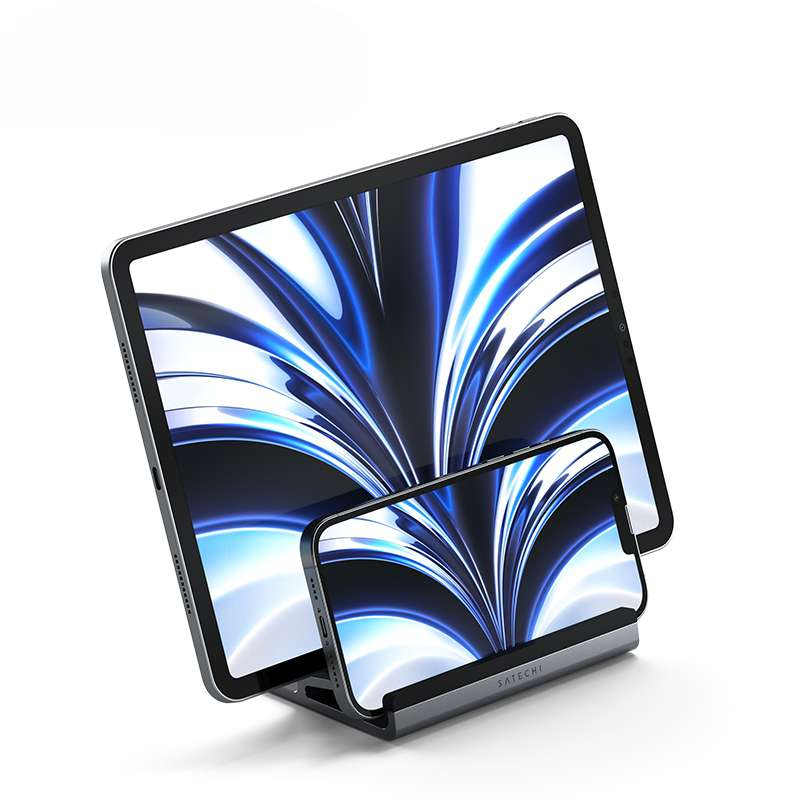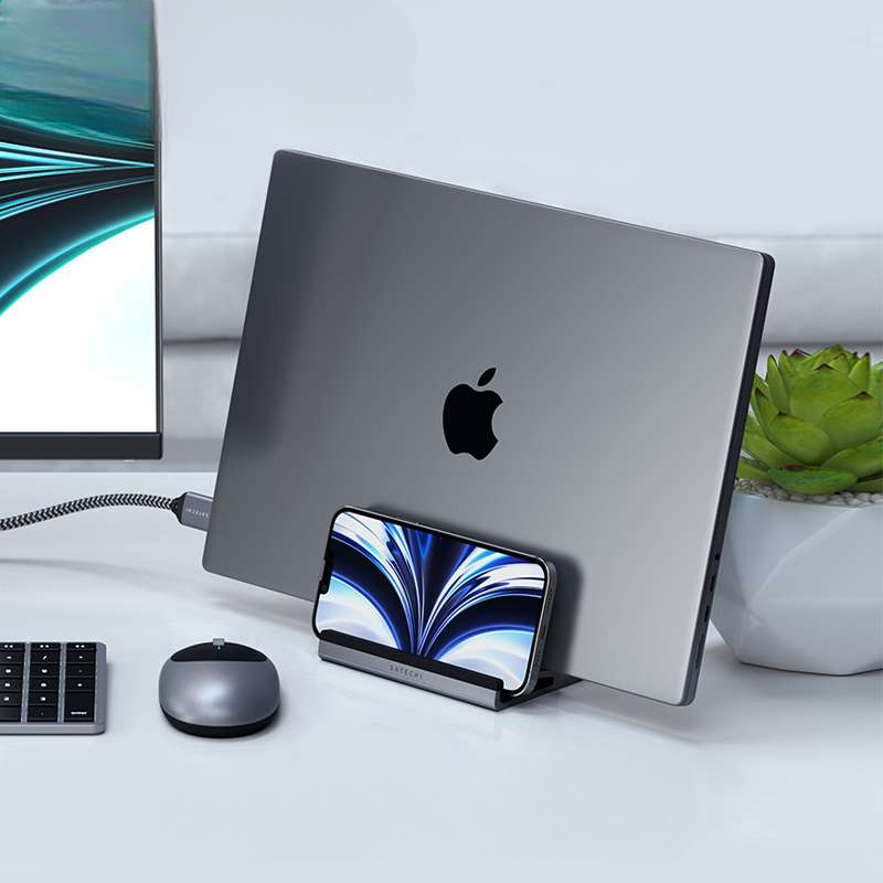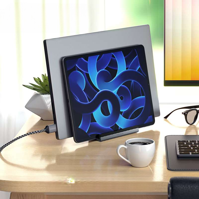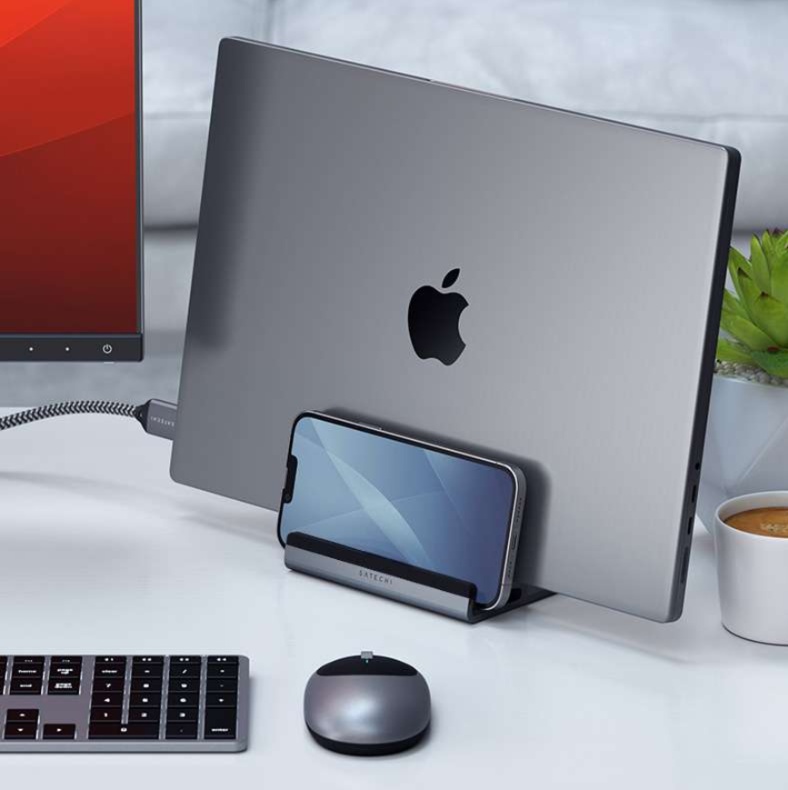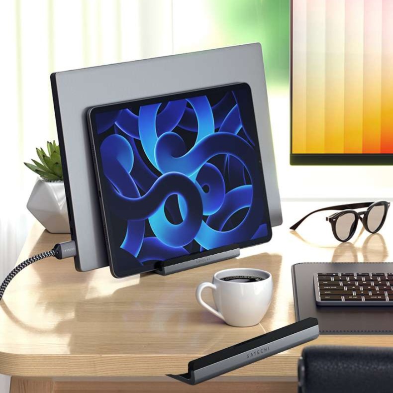 洗練された縦型パソコンスタンド。ノートパソコン用の多機能設計で、スマートフォンも同時に設置可能。