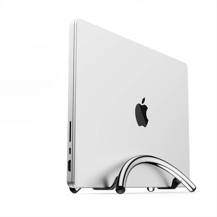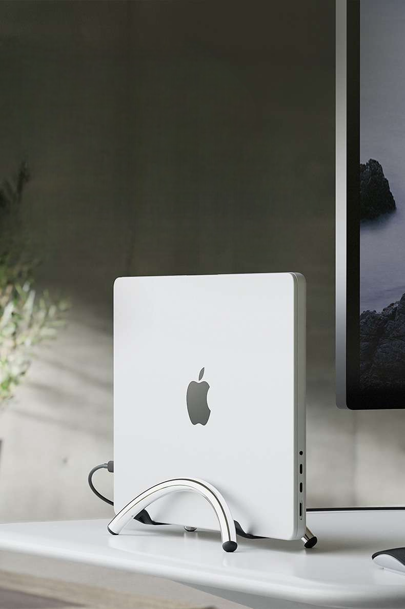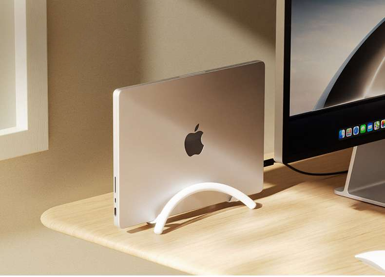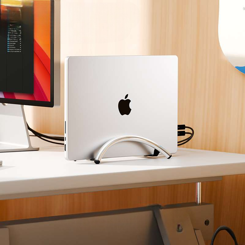 デスクの省スペース化を実現する縦置き型パソコンスタンド。 ノートパソコンをしっかり固定できる安定感のある曲線デザイン。 スタンドに縦置きすることで卓上スペースを有効活用。 放熱性も考慮された実用的なアイテムで、デスク周りをすっきり整理。