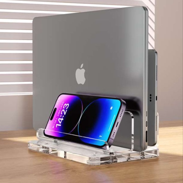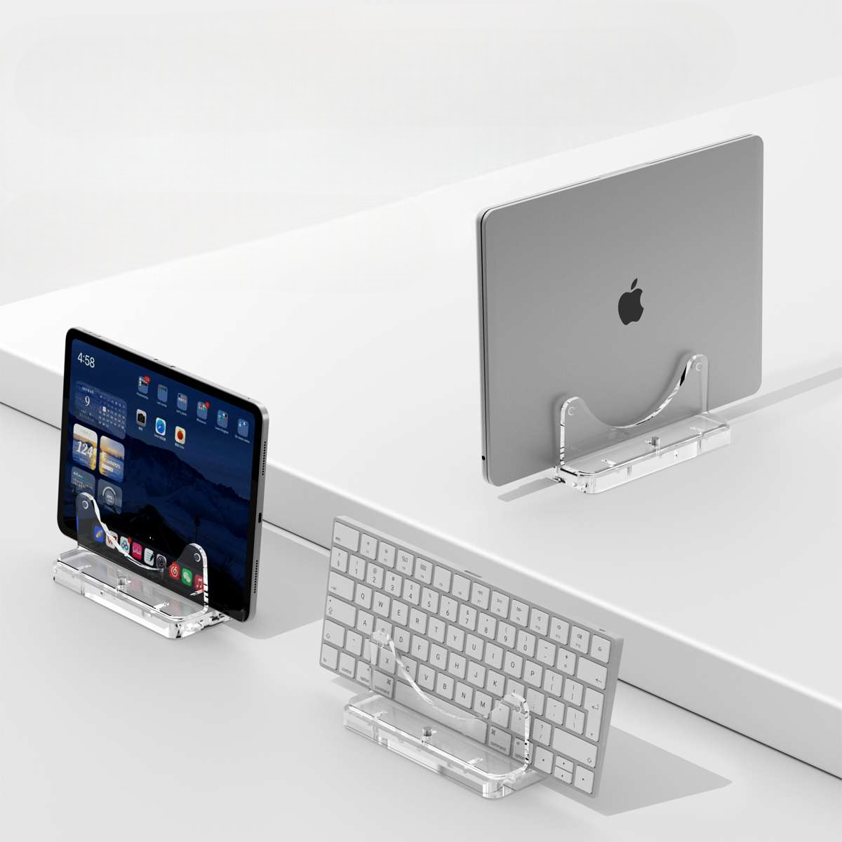 スペース節約に最適なパソコンスタンド。ノートパソコンを縦置きで収納できるスタイリッシュな設計。