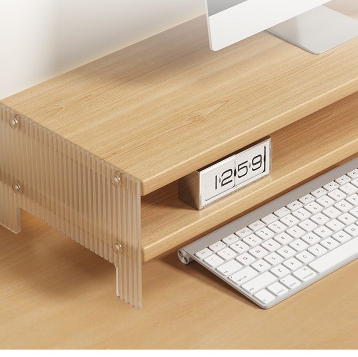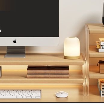 デスクトップ環境を快適に整える多機能パソコンスタンドです。 天然木の温かみある素材で作られた多段式の収納棚が特徴で、画面を見やすい高さに調整しながら周辺機器や文房具、小物類をすっきり整理できます。 左右に配置された棚には本や装飾品を置くことができ、作業効率と美しさを両立します。 キーボードやマウスを収納できるスペースも確保されており、使わない時はデスクトップをすっきり片付けられます。 在宅勤務や書斎での作業に最適なパソコンスタンドです。