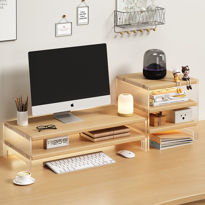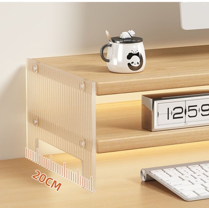 天然木の温かみある素材で作られた多段式の収納棚が特徴で、画面を見やすい高さに調整しながら周辺機器や文房具、小物類をすっきり整理できます。